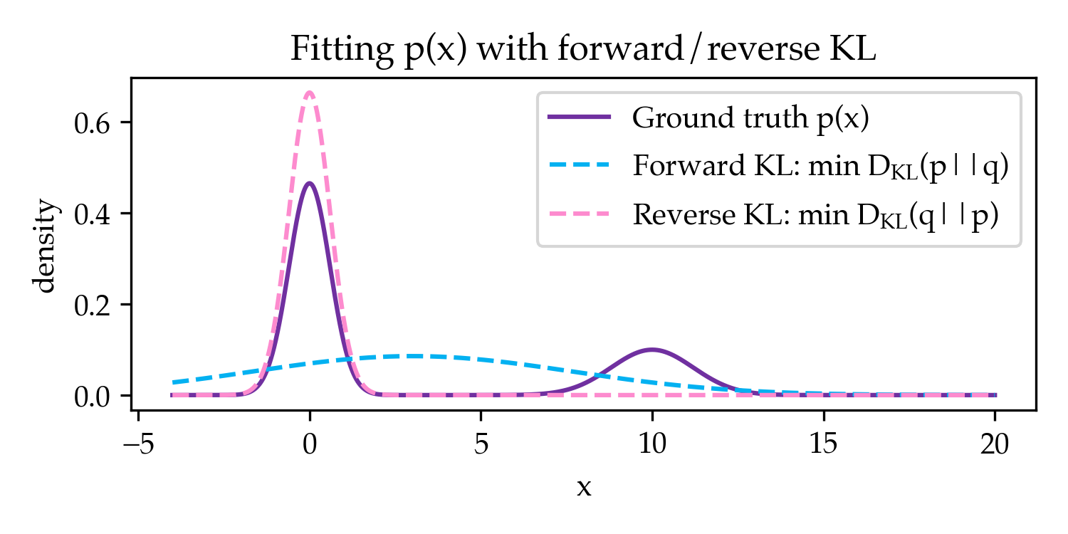 This captures the intuition that forward KL is a "mass-covering" divergence whereas reverse KL is a "mode-seeking" divergence. In the rest of this post, we will show how pre-training minimizes forward KL and RL minimizes reverse KL.