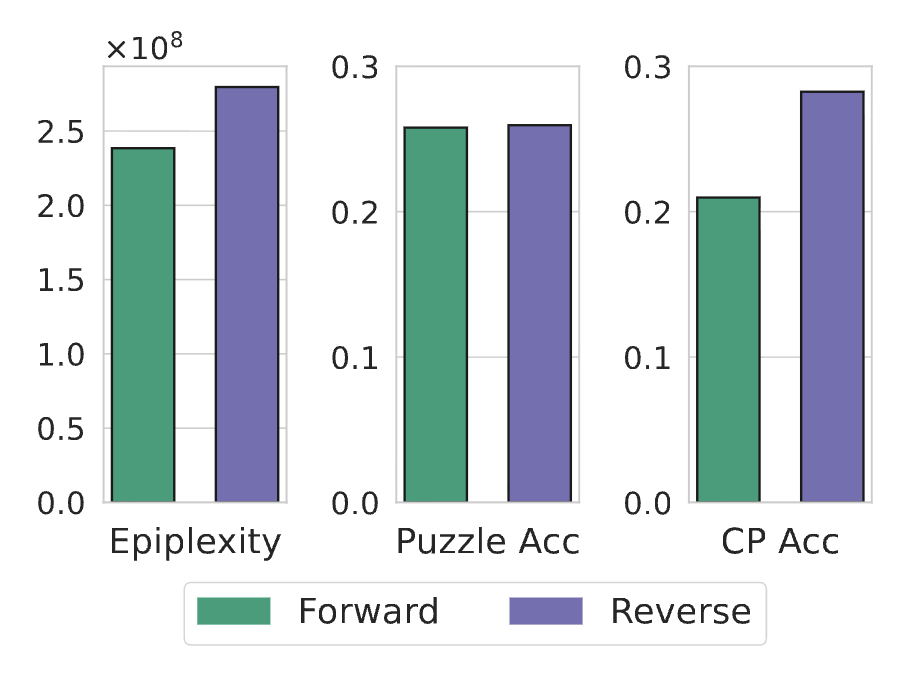 We will cover what I think is the most interesting experiment for the paper surrounding chess. Consider two distinct formats for chess pre-training, as visualized in Figure 2 left: seeing the moves of a game followed by the final chess board (forward), or seeing the final chess board followed by the initial moves (reverse). Both directions have the same loss minimizer since the factorization of the probability distribution (i.e. the order of the tokens) doesn't change the underlying distribution. However, predicting the board given the moves is more computationally easy relative to inferring the moves given the board by marginalizing over all possible games. This is related to a fact that the epiplexity of $f^-1$ is not necessarily close to the epiplexity of $f$ (on the other hand, Kolmogorov complexity barely changes thanks to Levin search).