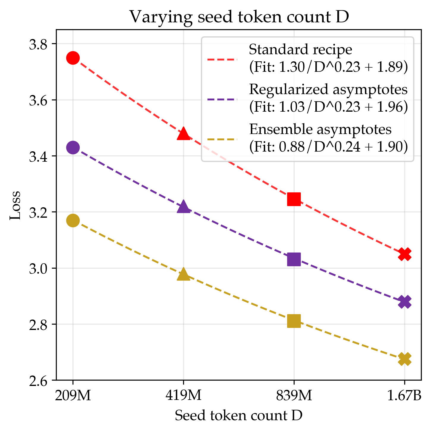 One striking empirical phenomenon is that under the infinite parameter limit, multiple algorithms share the same data scaling exponent and asymptote, visualized in Figure 1. If the exponents and asymptotes are actually equivalent between two algorithms, it suggests that an improvement in data efficiency is constant across all token counts, allowing one to iterate at smaller scales. It is unsurprising that the asymptote is the same, considering that the loss of most reasonable learning algorithms under both infinite compute and data approach their lowest possible value, i.e., the entropy of the data generating process. However, the alignment in the exponents suggests a deeper similarity between all of the methods.
